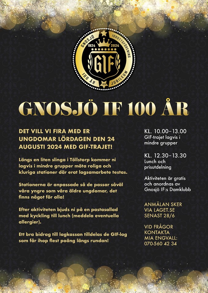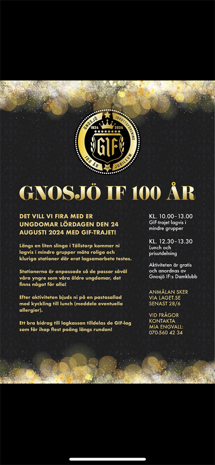 Gnosjö IF firar i år 100 år som förening. Detta kommer att firas under dagen och kvällen lör 24/8. För ungdomarna anordnar Damklubben under förmiddagen GIF-Trajet. Det blir en liten runda uppe i Töllstorp där man ska göra lite olika roliga och kluriga stationer. Det handlar mycket om att samarbeta inom gruppen. Efter Trajet bjuds alla på en lunch, en glass och prisutdelning. Priset kommer att vara ett bra tillskott till lagkassan. Till detta evenemang skulle vi vilja ha hjälp av lite stöttande föräldrar. Vi kommer behöva folk som instruerar vid stationerna och vi kommer behöva hjälp med matserveringen. Det kommer serveras en pastasallad med kyckling i skolmatsalen i Töllstorpshallen. Någon vecka innan aktiviteten kommer mer info om mer exakt starttid, hur ni delar upp ert lag i mindre grupper och hur många vuxna vi behöver ha hjälp av. Om ni har möjlighet att hjälpa till meddela gärna någon av oss ledare eller skriv en kommentar här nedan så förmedlar vi det vidare till damklubben. /Ledarna F2014 27 maj 2024 0kommentarer